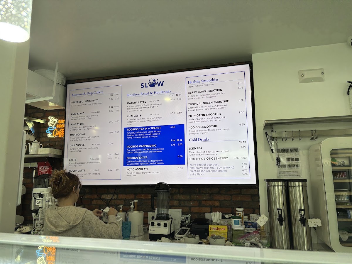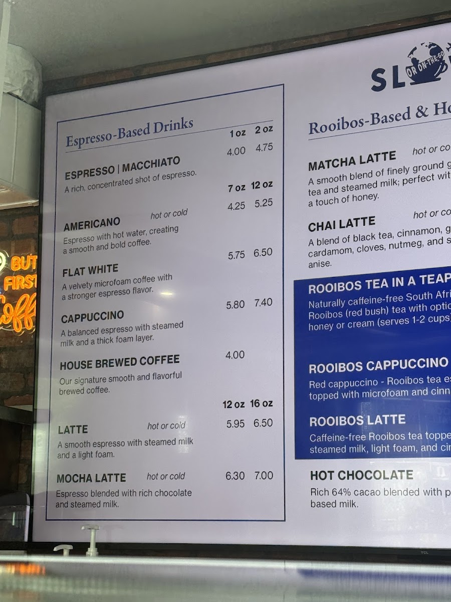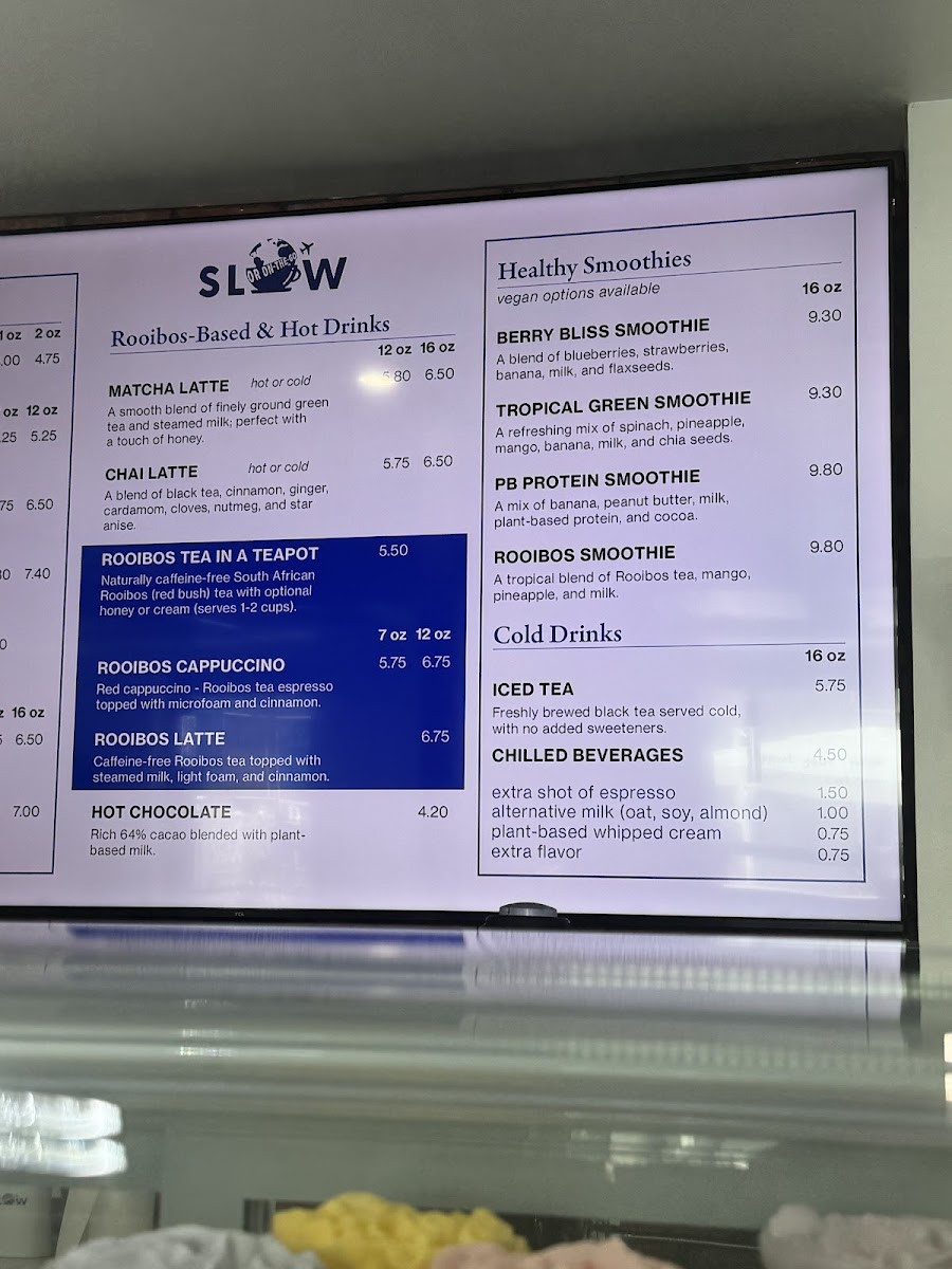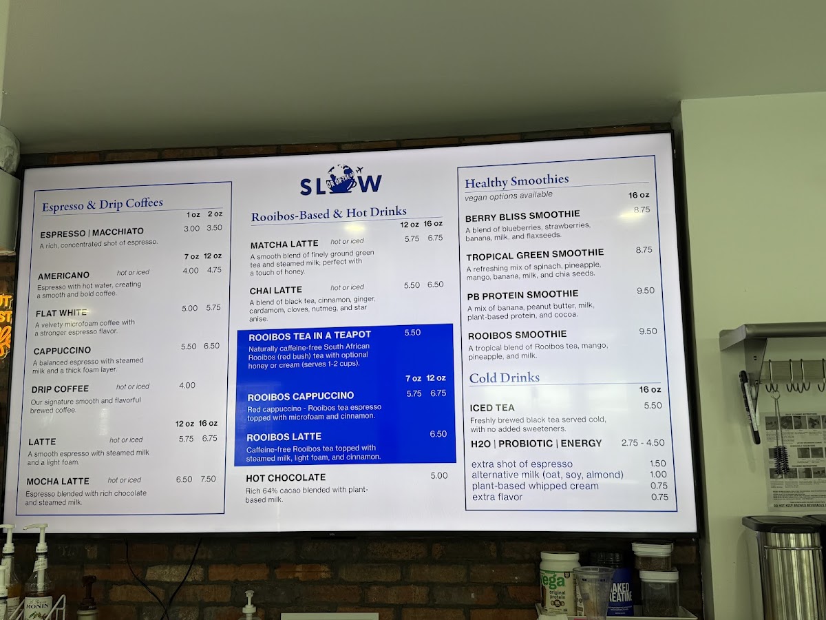 Cuisine Type: At SLOW… Or On-The-Go™ Café, the offerings blend expertly crafted espresso drinks with refreshing smoothies and wholesome food options. Picture yourself seated in the cozy setting while enjoying a rich Espresso Macchiato ($3.00)—each concentrated shot of espresso is an exquisite experience. For those looking for something milder yet bold, the Americano ($4.00) combines the best of both worlds with espresso and hot water.